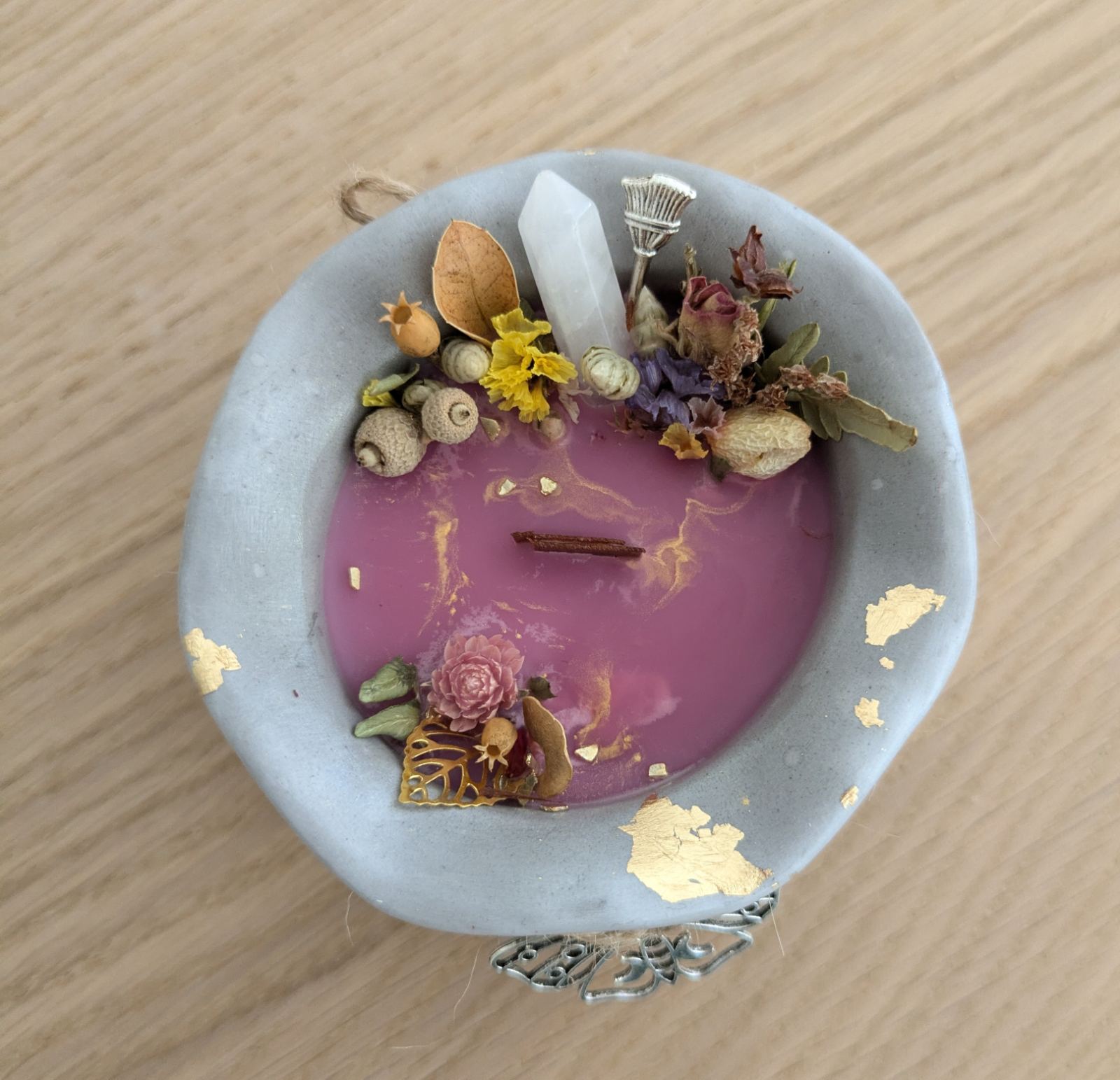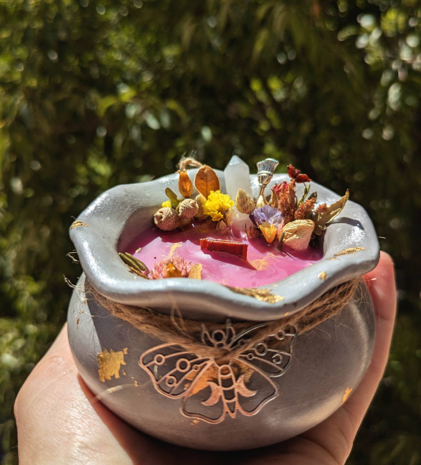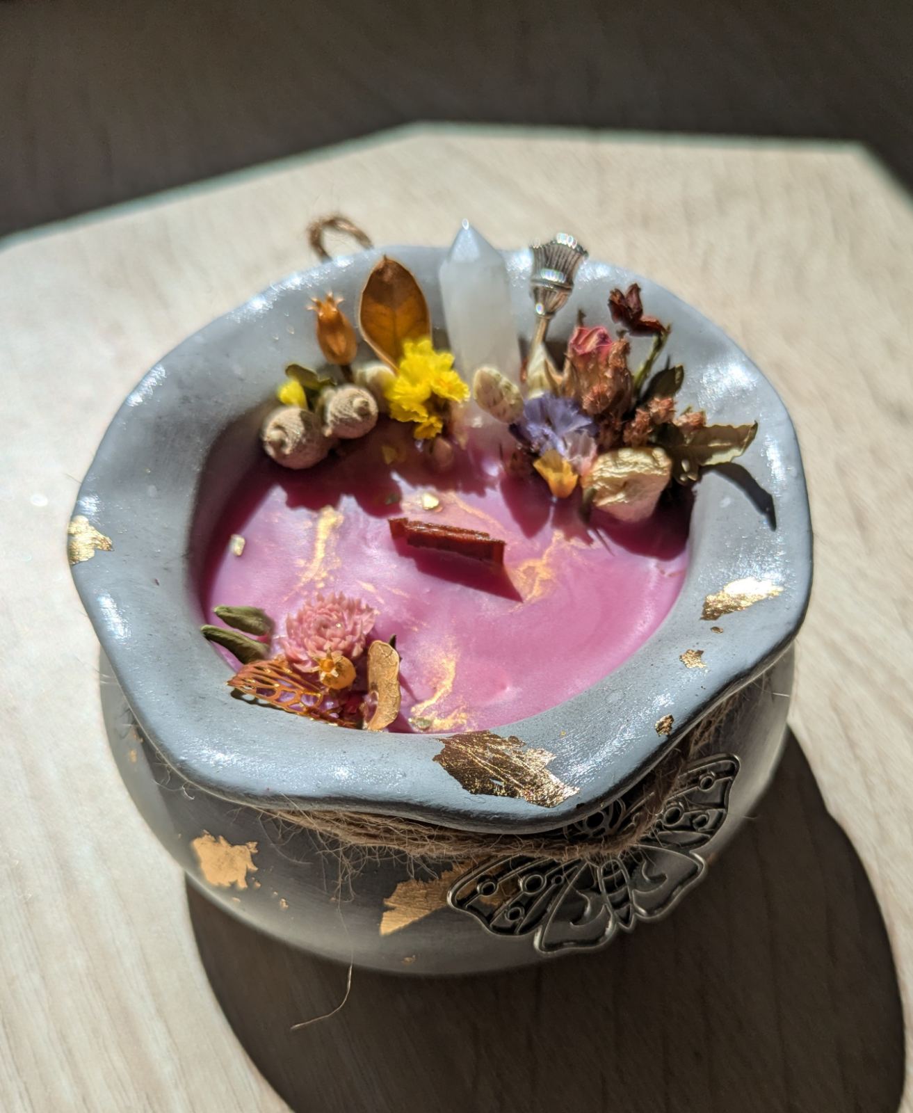Elle repose dans un bougeoir en plâtre 100 % naturel, façonné à la main en forme de chaudron de sorcière, une pièce unique mêlant artisanat et magie.
